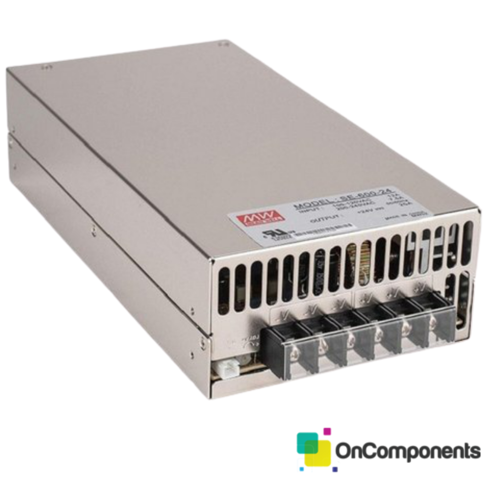 Meanwell AC/DC Enclosed Switching SMPS SE-600-24 Switch Mode Power Supply 24V 25A 600W AC to DC Converter With Universal Input Voltage of Single Phase 115VAC & 230VAC 50/60hz.